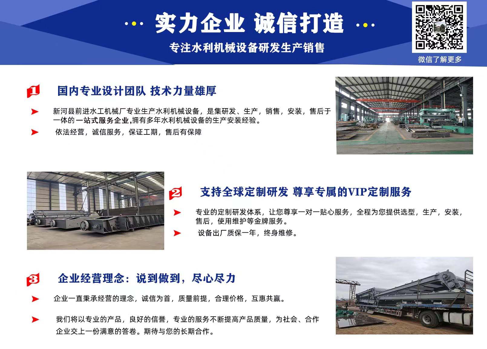 新河縣前進水工機械廠是一家專門從事水利工程設備研發生產的廠家,現有員工228人,各類高、中級專業工程技術人員近30人,技術生產工人180多人。公司占地面積14674平方米。公司擁有車、鉗、刨、銑、冷作、鈑金、鑄造等,工種齊全,加工能力和技術力量雄厚,并具備理化測試手段與儀器設備。前進水工專注景觀閘門,鋼壩,合頁壩,液壓升降壩,液壓閘門,臥倒門,一字門,人字門,液壓啟閉機,卷揚啟閉機,螺桿啟閉機,清污機,除污機,閘門,拍門等設備的研發與生產,是新河水利工程產品行業的領跑者,不僅在同行業群中揭起了一次又一次的技術革新,更為水利工程企業提供了更高更大的選擇平臺。